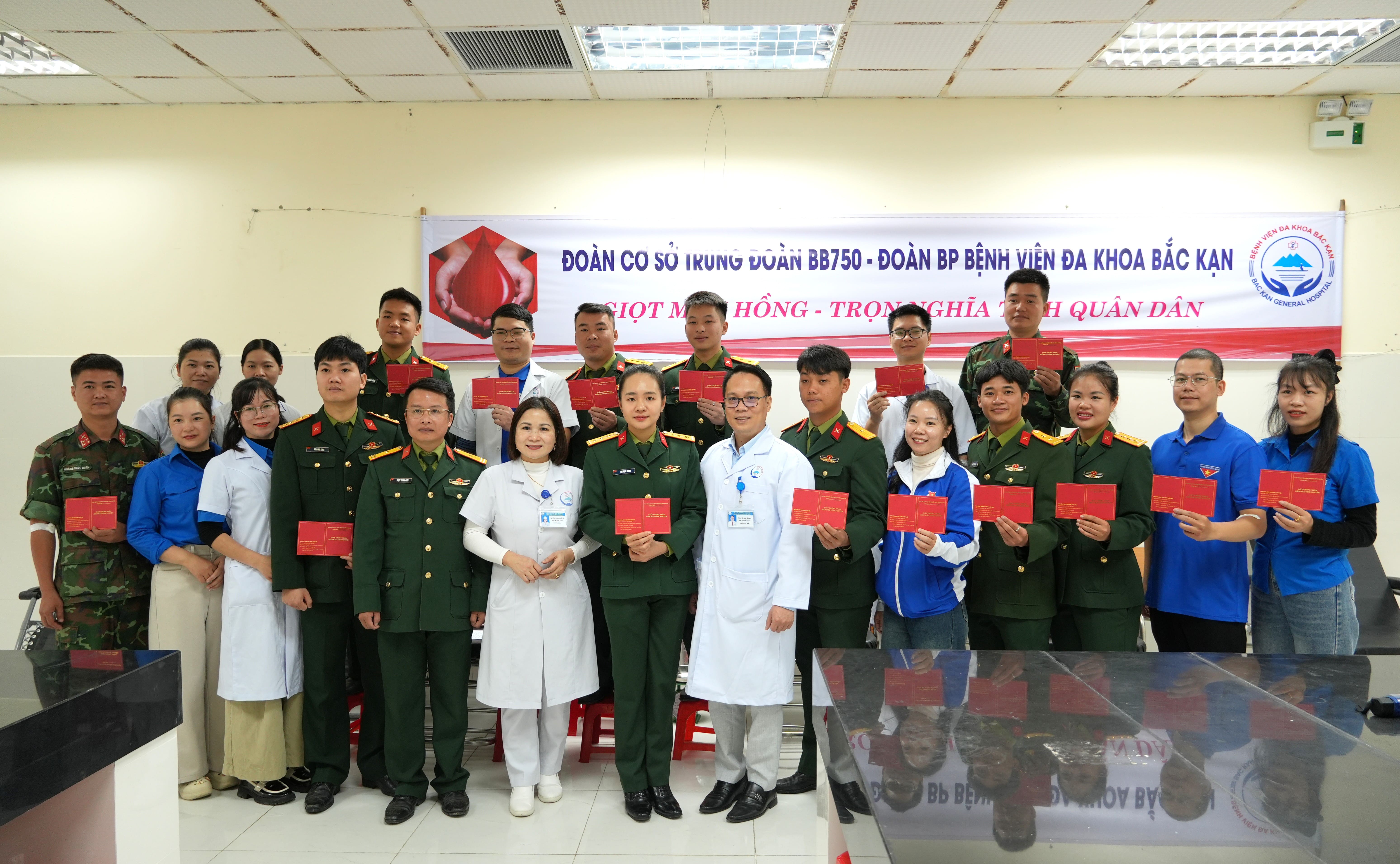 Thực hiện Kế hoạch Chương trình Kết nghĩa giữa Đoàn bộ phận Bệnh viện Đa khoa Bắc Kạn và Đoàn cơ sở Trung đoàn BB750. Sáng 11/12, Đoàn thanh niên hai đơn vị phối hợp tổ chức Chương trình hiến máu tình nguyện với chủ đề “Giọt máu hồng - Trọn nghĩa tình quân dân”.