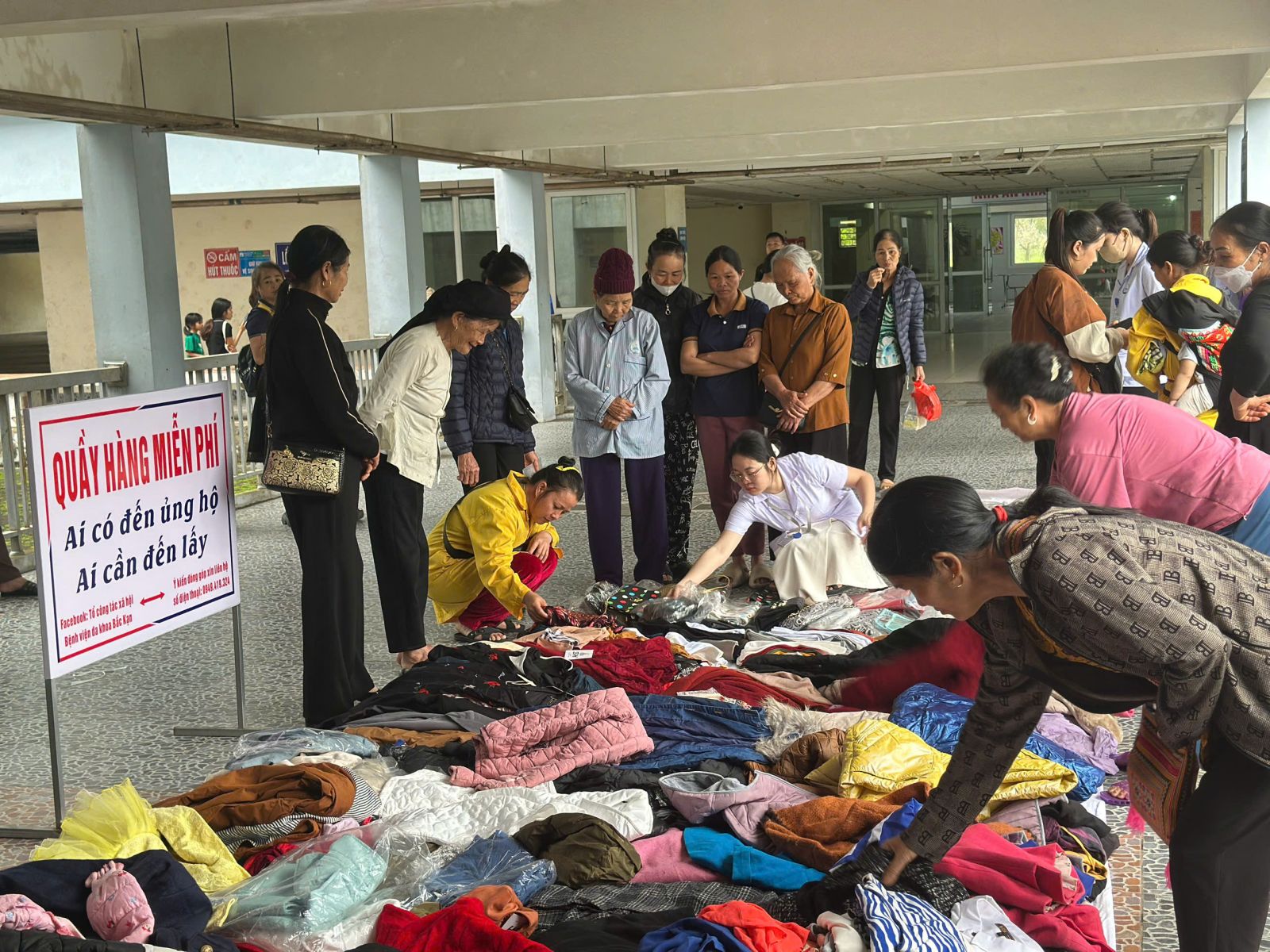- Quầy hàng “0 đồng” với 20 bao tải quần áo, giày, dép, túi xách để những người bệnh cần có thể đến lấy.