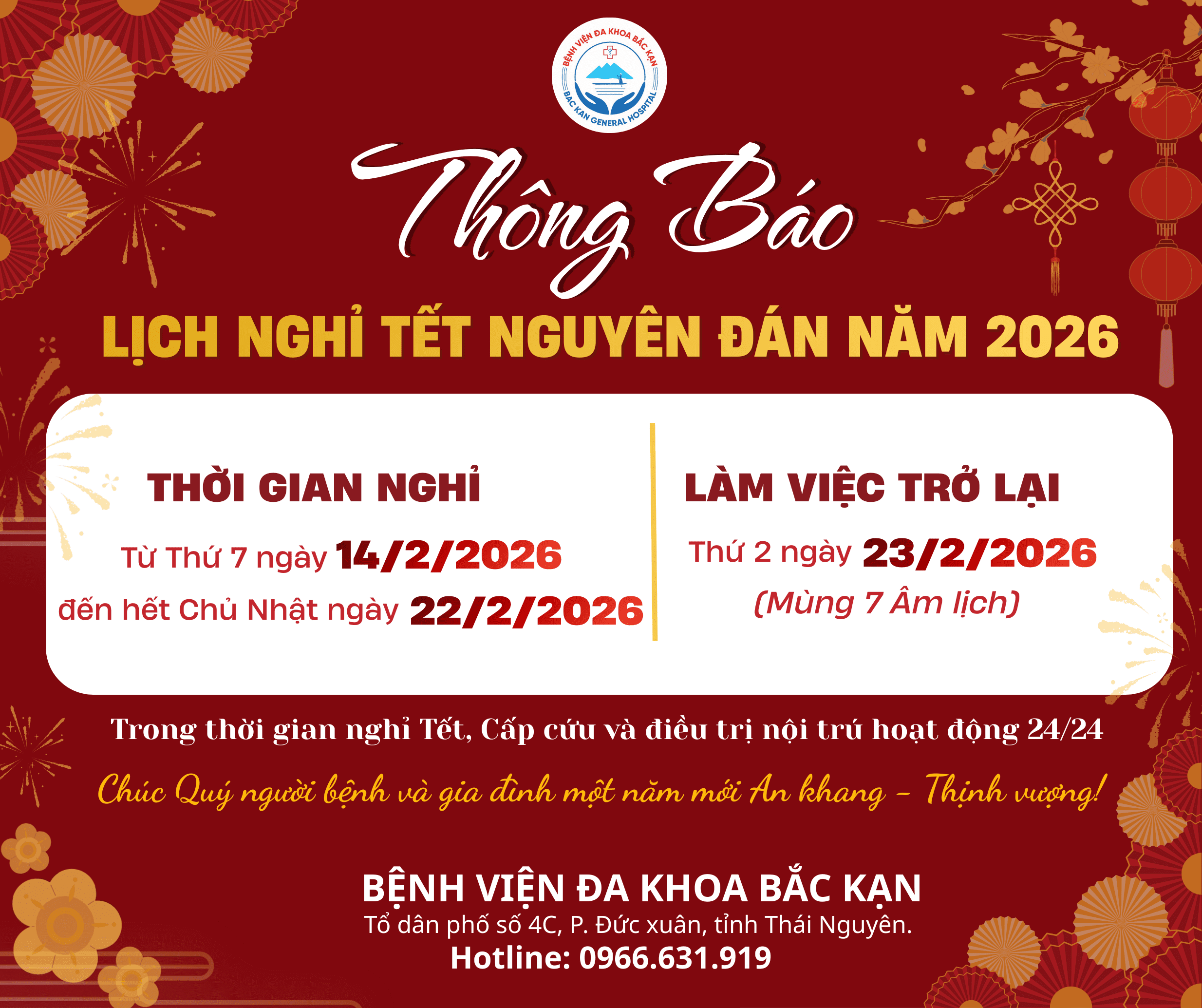 Bệnh viện Đa khoa Bắc Kạn thông báo lịch nghỉ Tết Nguyên đán 2026 như sau:
